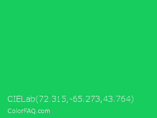 CIELab 72.315,-65.273,43.764 Color is a normal green color and the nearest color is Malachite #0bda51. Hex code #16cc5c and RGB value is rgb(22,204,92). In RGB color space, this color is composed of 9% red, 80% green, 36% blue, In CMYK color space, this color is composed of 89% cyan, 0% magenta, 55% yellow , 20% black , In HSL color space, this color has a hue angle of 143° , 81% saturation and 44% lightness.