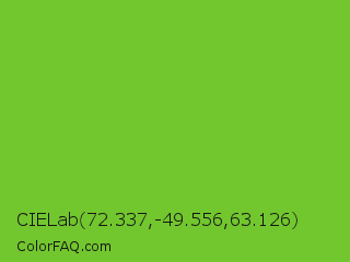 CIELab 72.337,-49.556,63.126 Color is a normal green color and the nearest color is Lima #76bd17. Hex code #72c62e and RGB value is rgb(114,198,46). In RGB color space, this color is composed of 45% red, 78% green, 18% blue, In CMYK color space, this color is composed of 42% cyan, 0% magenta, 77% yellow , 22% black , In HSL color space, this color has a hue angle of 93° , 62% saturation and 48% lightness.