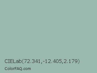 CIELab 72.341,-12.405,2.179 Color is a light green color and the nearest color is Summer Green #96bbab. Hex code #9ab8ad and RGB value is rgb(154,184,173). In RGB color space, this color is composed of 60% red, 72% green, 68% blue, In CMYK color space, this color is composed of 16% cyan, 0% magenta, 6% yellow , 28% black , In HSL color space, this color has a hue angle of 158° , 17% saturation and 66% lightness.
