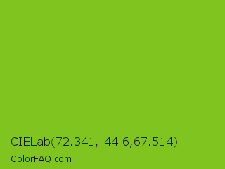 CIELab 72.341,-44.6,67.514 Color is a normal green color and the nearest color is Lima #76bd17. Hex code #80c41f and RGB value is rgb(128,196,31). In RGB color space, this color is composed of 50% red, 77% green, 12% blue, In CMYK color space, this color is composed of 35% cyan, 0% magenta, 84% yellow , 23% black , In HSL color space, this color has a hue angle of 85° , 73% saturation and 45% lightness.