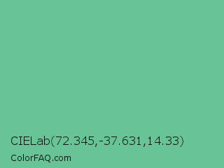 CIELab 72.345,-37.631,14.33 Color is a normal green color and the nearest color is Silver Tree #66b58f. Hex code #68c396 and RGB value is rgb(104,195,150). In RGB color space, this color is composed of 41% red, 76% green, 59% blue, In CMYK color space, this color is composed of 47% cyan, 0% magenta, 23% yellow , 24% black , In HSL color space, this color has a hue angle of 150° , 43% saturation and 59% lightness.