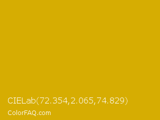 CIELab 72.354,2.065,74.829 Color is a normal yellow color and the nearest color is Galliano #dcb20c. Hex code #d6ad02 and RGB value is rgb(214,173,2). In RGB color space, this color is composed of 84% red, 68% green, 1% blue, In CMYK color space, this color is composed of 0% cyan, 19% magenta, 99% yellow , 16% black , In HSL color space, this color has a hue angle of 48° , 98% saturation and 42% lightness.