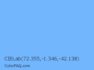CIELab 72.355,-1.346,-42.138 Color is a light blue color and the nearest color is French Sky Blue #77b5fe. Hex code #72b6fe and RGB value is rgb(114,182,254). In RGB color space, this color is composed of 45% red, 71% green, 100% blue, In CMYK color space, this color is composed of 55% cyan, 28% magenta, 0% yellow , 0% black , In HSL color space, this color has a hue angle of 211° , 99% saturation and 72% lightness.
