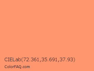 CIELab 72.361,35.691,37.93 Color is a light orange color and the nearest color is Atomic Tangerine #ff9966. Hex code #ff966e and RGB value is rgb(255,150,110). In RGB color space, this color is composed of 100% red, 59% green, 43% blue, In CMYK color space, this color is composed of 0% cyan, 41% magenta, 57% yellow , 0% black , In HSL color space, this color has a hue angle of 17° , 100% saturation and 72% lightness.