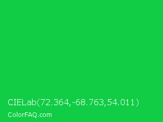 CIELab 72.364,-68.763,54.011 Color is a normal green color and the nearest color is Malachite #0bda51. Hex code #10cd45 and RGB value is rgb(16,205,69). In RGB color space, this color is composed of 6% red, 80% green, 27% blue, In CMYK color space, this color is composed of 92% cyan, 0% magenta, 66% yellow , 20% black , In HSL color space, this color has a hue angle of 137° , 86% saturation and 43% lightness.