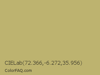 CIELab 72.366,-6.272,35.956 Color is a normal yellow color and the nearest color is Dark Khaki #bdb76b. Hex code #bdb36f and RGB value is rgb(189,179,111). In RGB color space, this color is composed of 74% red, 70% green, 44% blue, In CMYK color space, this color is composed of 0% cyan, 5% magenta, 41% yellow , 26% black , In HSL color space, this color has a hue angle of 52° , 37% saturation and 59% lightness.