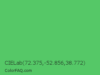 CIELab 72.375,-52.856,38.772 Color is a normal green color and the nearest color is Emerald #50c878. Hex code #55c867 and RGB value is rgb(85,200,103). In RGB color space, this color is composed of 33% red, 78% green, 40% blue, In CMYK color space, this color is composed of 58% cyan, 0% magenta, 49% yellow , 22% black , In HSL color space, this color has a hue angle of 129° , 51% saturation and 56% lightness.