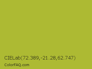 CIELab 72.389,-21.28,62.747 Color is a normal yellow color and the nearest color is Android Green #a4c639. Hex code #adba33 and RGB value is rgb(173,186,51). In RGB color space, this color is composed of 68% red, 73% green, 20% blue, In CMYK color space, this color is composed of 7% cyan, 0% magenta, 73% yellow , 27% black , In HSL color space, this color has a hue angle of 66° , 57% saturation and 46% lightness.