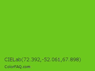 CIELab 72.392,-52.061,67.898 Color is a normal green color and the nearest color is Lima #76bd17. Hex code #6ec71c and RGB value is rgb(110,199,28). In RGB color space, this color is composed of 43% red, 78% green, 11% blue, In CMYK color space, this color is composed of 45% cyan, 0% magenta, 86% yellow , 22% black , In HSL color space, this color has a hue angle of 91° , 75% saturation and 45% lightness.