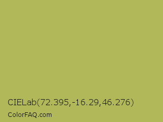 CIELab 72.395,-16.29,46.276 Color is a normal yellow color and the nearest color is Olive Green #b5b35c. Hex code #b0b85a and RGB value is rgb(176,184,90). In RGB color space, this color is composed of 69% red, 72% green, 35% blue, In CMYK color space, this color is composed of 4% cyan, 0% magenta, 51% yellow , 28% black , In HSL color space, this color has a hue angle of 65° , 40% saturation and 54% lightness.