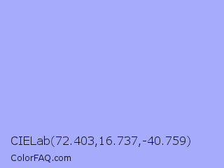 CIELab 72.403,16.737,-40.759 Color is a very light blue color and the nearest color is Perano #a9bef2. Hex code #a6abfc and RGB value is rgb(166,171,252). In RGB color space, this color is composed of 65% red, 67% green, 99% blue, In CMYK color space, this color is composed of 34% cyan, 32% magenta, 0% yellow , 1% black , In HSL color space, this color has a hue angle of 237° , 93% saturation and 82% lightness.