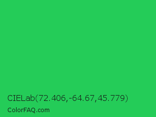 CIELab 72.406,-64.67,45.779 Color is a normal green color and the nearest color is Malachite #0bda51. Hex code #24cc58 and RGB value is rgb(36,204,88). In RGB color space, this color is composed of 14% red, 80% green, 35% blue, In CMYK color space, this color is composed of 82% cyan, 0% magenta, 57% yellow , 20% black , In HSL color space, this color has a hue angle of 139° , 70% saturation and 47% lightness.