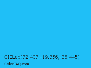 CIELab 72.407,-19.356,-38.445 Color is a normal blue color and the nearest color is Spiro Disco Ball #0fc0fc. Hex code #1fbff7 and RGB value is rgb(31,191,247). In RGB color space, this color is composed of 12% red, 75% green, 97% blue, In CMYK color space, this color is composed of 87% cyan, 23% magenta, 0% yellow , 3% black , In HSL color space, this color has a hue angle of 196° , 93% saturation and 55% lightness.