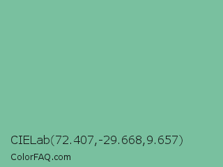 CIELab 72.407,-29.668,9.657 Color is a light green color and the nearest color is Acapulco #7cb0a1. Hex code #79c09f and RGB value is rgb(121,192,159). In RGB color space, this color is composed of 47% red, 75% green, 62% blue, In CMYK color space, this color is composed of 37% cyan, 0% magenta, 17% yellow , 25% black , In HSL color space, this color has a hue angle of 152° , 36% saturation and 61% lightness.