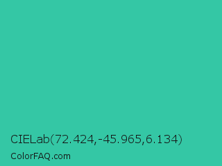 CIELab 72.424,-45.965,6.134 Color is a normal cyan color and the nearest color is Shamrock #33cc99. Hex code #34c7a5 and RGB value is rgb(52,199,165). In RGB color space, this color is composed of 20% red, 78% green, 65% blue, In CMYK color space, this color is composed of 74% cyan, 0% magenta, 17% yellow , 22% black , In HSL color space, this color has a hue angle of 166° , 59% saturation and 49% lightness.