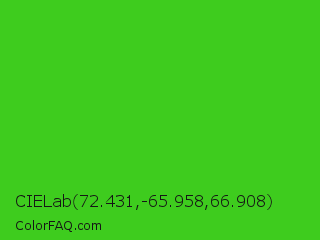 CIELab 72.431,-65.958,66.908 Color is a normal green color and the nearest color is Harlequin Green #46cb18. Hex code #3ecc1e and RGB value is rgb(62,204,30). In RGB color space, this color is composed of 24% red, 80% green, 12% blue, In CMYK color space, this color is composed of 70% cyan, 0% magenta, 85% yellow , 20% black , In HSL color space, this color has a hue angle of 109° , 74% saturation and 46% lightness.