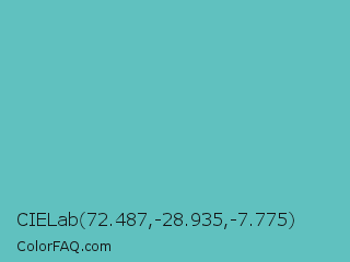 CIELab 72.487,-28.935,-7.775 Color is a normal cyan color and the nearest color is Fountain Blue #56b4be. Hex code #60c1bf and RGB value is rgb(96,193,191). In RGB color space, this color is composed of 38% red, 76% green, 75% blue, In CMYK color space, this color is composed of 50% cyan, 0% magenta, 1% yellow , 24% black , In HSL color space, this color has a hue angle of 179° , 44% saturation and 57% lightness.