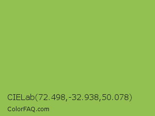 CIELab 72.498,-32.938,50.078 Color is a normal green color and the nearest color is Dollar Bill #85bb65. Hex code #92c051 and RGB value is rgb(146,192,81). In RGB color space, this color is composed of 57% red, 75% green, 32% blue, In CMYK color space, this color is composed of 24% cyan, 0% magenta, 58% yellow , 25% black , In HSL color space, this color has a hue angle of 85° , 47% saturation and 54% lightness.