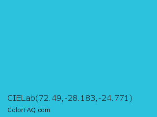 CIELab 72.49,-28.183,-24.771 Color is a normal cyan color and the nearest color is Scooter #2ebfd4. Hex code #2cc2de and RGB value is rgb(44,194,222). In RGB color space, this color is composed of 17% red, 76% green, 87% blue, In CMYK color space, this color is composed of 80% cyan, 13% magenta, 0% yellow , 13% black , In HSL color space, this color has a hue angle of 189° , 73% saturation and 52% lightness.