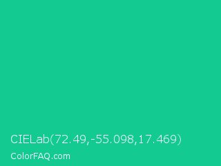 CIELab 72.49,-55.098,17.469 Color is a normal green color and the nearest color is Caribbean Green #00cc99. Hex code #13ca90 and RGB value is rgb(19,202,144). In RGB color space, this color is composed of 7% red, 79% green, 56% blue, In CMYK color space, this color is composed of 91% cyan, 0% magenta, 29% yellow , 21% black , In HSL color space, this color has a hue angle of 161° , 83% saturation and 43% lightness.