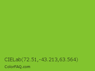 CIELab 72.51,-43.213,63.564 Color is a normal green color and the nearest color is Atlantis #97cd2d. Hex code #82c42e and RGB value is rgb(130,196,46). In RGB color space, this color is composed of 51% red, 77% green, 18% blue, In CMYK color space, this color is composed of 34% cyan, 0% magenta, 77% yellow , 23% black , In HSL color space, this color has a hue angle of 86° , 62% saturation and 47% lightness.