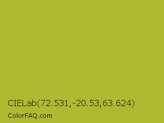 CIELab 72.531,-20.53,63.624 Color is a normal yellow color and the nearest color is Android Green #a4c639. Hex code #afba31 and RGB value is rgb(175,186,49). In RGB color space, this color is composed of 69% red, 73% green, 19% blue, In CMYK color space, this color is composed of 6% cyan, 0% magenta, 74% yellow , 27% black , In HSL color space, this color has a hue angle of 65° , 58% saturation and 46% lightness.