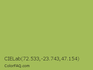 CIELab 72.533,-23.743,47.154 Color is a normal lime color and the nearest color is Middle Green Yellow #acbf60. Hex code #a3bc58 and RGB value is rgb(163,188,88). In RGB color space, this color is composed of 64% red, 74% green, 35% blue, In CMYK color space, this color is composed of 13% cyan, 0% magenta, 53% yellow , 26% black , In HSL color space, this color has a hue angle of 75° , 43% saturation and 54% lightness.