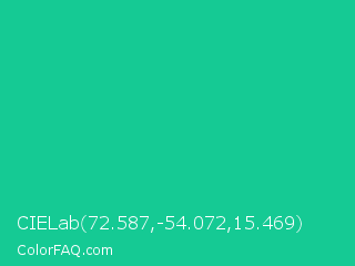 CIELab 72.587,-54.072,15.469 Color is a normal green color and the nearest color is Caribbean Green #00cc99. Hex code #15ca94 and RGB value is rgb(21,202,148). In RGB color space, this color is composed of 8% red, 79% green, 58% blue, In CMYK color space, this color is composed of 90% cyan, 0% magenta, 27% yellow , 21% black , In HSL color space, this color has a hue angle of 162° , 81% saturation and 44% lightness.