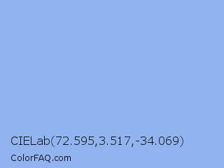 CIELab 72.595,3.517,-34.069 Color is a light blue color and the nearest color is Jordy Blue #8ab9f1. Hex code #91b3f0 and RGB value is rgb(145,179,240). In RGB color space, this color is composed of 57% red, 70% green, 94% blue, In CMYK color space, this color is composed of 40% cyan, 25% magenta, 0% yellow , 6% black , In HSL color space, this color has a hue angle of 219° , 76% saturation and 75% lightness.