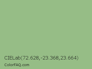 CIELab 72.628,-23.368,23.664 Color is a light green color and the nearest color is Dark Sea Green #8fbc8f. Hex code #96bd86 and RGB value is rgb(150,189,134). In RGB color space, this color is composed of 59% red, 74% green, 53% blue, In CMYK color space, this color is composed of 21% cyan, 0% magenta, 29% yellow , 26% black , In HSL color space, this color has a hue angle of 103° , 29% saturation and 63% lightness.