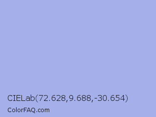 CIELab 72.628,9.688,-30.654 Color is a light blue color and the nearest color is Maximum Blue Purple #acace6. Hex code #a5afea and RGB value is rgb(165,175,234). In RGB color space, this color is composed of 65% red, 69% green, 92% blue, In CMYK color space, this color is composed of 29% cyan, 25% magenta, 0% yellow , 8% black , In HSL color space, this color has a hue angle of 231° , 62% saturation and 78% lightness.