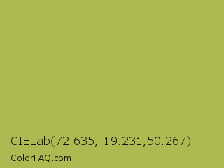 CIELab 72.635,-19.231,50.267 Color is a normal yellow color and the nearest color is Olive Green #b5b35c. Hex code #adba52 and RGB value is rgb(173,186,82). In RGB color space, this color is composed of 68% red, 73% green, 32% blue, In CMYK color space, this color is composed of 7% cyan, 0% magenta, 56% yellow , 27% black , In HSL color space, this color has a hue angle of 68° , 43% saturation and 53% lightness.
