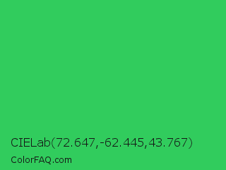 CIELab 72.647,-62.445,43.767 Color is a normal green color and the nearest color is UFO Green #3cd070. Hex code #31cc5d and RGB value is rgb(49,204,93). In RGB color space, this color is composed of 19% red, 80% green, 36% blue, In CMYK color space, this color is composed of 76% cyan, 0% magenta, 54% yellow , 20% black , In HSL color space, this color has a hue angle of 137° , 61% saturation and 50% lightness.