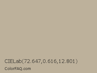 CIELab 72.647,0.616,12.801 Color is a light orange color and the nearest color is Malta #bdb2a1. Hex code #bdb19b and RGB value is rgb(189,177,155). In RGB color space, this color is composed of 74% red, 69% green, 61% blue, In CMYK color space, this color is composed of 0% cyan, 6% magenta, 18% yellow , 26% black , In HSL color space, this color has a hue angle of 39° , 20% saturation and 67% lightness.
