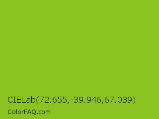 CIELab 72.655,-39.946,67.039 Color is a normal green color and the nearest color is Atlantis #97cd2d. Hex code #8bc323 and RGB value is rgb(139,195,35). In RGB color space, this color is composed of 55% red, 76% green, 14% blue, In CMYK color space, this color is composed of 29% cyan, 0% magenta, 82% yellow , 24% black , In HSL color space, this color has a hue angle of 81° , 70% saturation and 45% lightness.