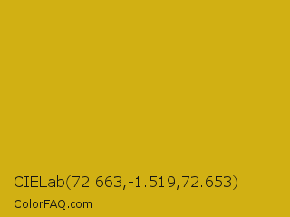 CIELab 72.663,-1.519,72.653 Color is a normal yellow color and the nearest color is Galliano #dcb20c. Hex code #d1b013 and RGB value is rgb(209,176,19). In RGB color space, this color is composed of 82% red, 69% green, 7% blue, In CMYK color space, this color is composed of 0% cyan, 16% magenta, 91% yellow , 18% black , In HSL color space, this color has a hue angle of 50° , 83% saturation and 45% lightness.