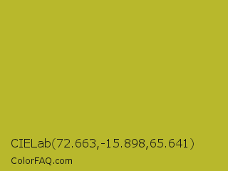 CIELab 72.663,-15.898,65.641 Color is a normal yellow color and the nearest color is Acid Green #b0bf1a. Hex code #b8b82c and RGB value is rgb(184,184,44). In RGB color space, this color is composed of 72% red, 72% green, 17% blue, In CMYK color space, this color is composed of 0% cyan, 0% magenta, 76% yellow , 28% black , In HSL color space, this color has a hue angle of 60° , 61% saturation and 45% lightness.