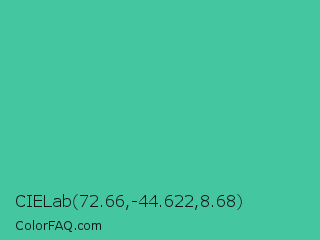 CIELab 72.66,-44.622,8.68 Color is a normal green color and the nearest color is Puerto Rico #3fc1aa. Hex code #44c7a1 and RGB value is rgb(68,199,161). In RGB color space, this color is composed of 27% red, 78% green, 63% blue, In CMYK color space, this color is composed of 66% cyan, 0% magenta, 19% yellow , 22% black , In HSL color space, this color has a hue angle of 163° , 54% saturation and 52% lightness.