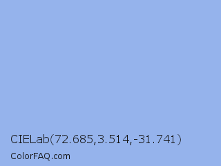 CIELab 72.685,3.514,-31.741 Color is a light blue color and the nearest color is Jordy Blue #8ab9f1. Hex code #95b3ec and RGB value is rgb(149,179,236). In RGB color space, this color is composed of 58% red, 70% green, 93% blue, In CMYK color space, this color is composed of 37% cyan, 24% magenta, 0% yellow , 7% black , In HSL color space, this color has a hue angle of 219° , 70% saturation and 75% lightness.