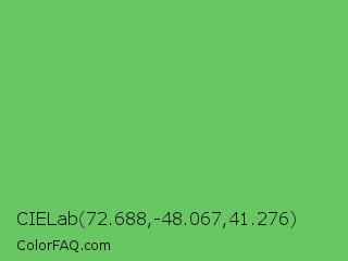 CIELab 72.688,-48.067,41.276 Color is a normal green color and the nearest color is Mantis #74c365. Hex code #68c763 and RGB value is rgb(104,199,99). In RGB color space, this color is composed of 41% red, 78% green, 39% blue, In CMYK color space, this color is composed of 48% cyan, 0% magenta, 50% yellow , 22% black , In HSL color space, this color has a hue angle of 117° , 47% saturation and 58% lightness.