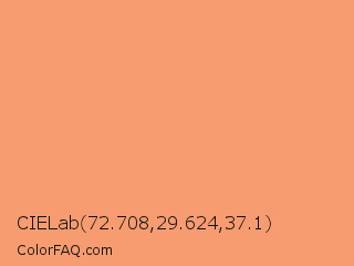 CIELab 72.708,29.624,37.1 Color is a light orange color and the nearest color is Atomic Tangerine #ff9966. Hex code #f79c70 and RGB value is rgb(247,156,112). In RGB color space, this color is composed of 97% red, 61% green, 44% blue, In CMYK color space, this color is composed of 0% cyan, 37% magenta, 55% yellow , 3% black , In HSL color space, this color has a hue angle of 20° , 89% saturation and 70% lightness.