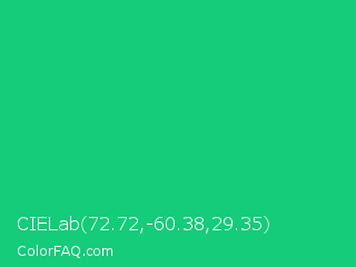 CIELab 72.72,-60.38,29.35 Color is a normal green color and the nearest color is Mountain Meadow Crayola #1ab385. Hex code #14cc7a and RGB value is rgb(20,204,122). In RGB color space, this color is composed of 8% red, 80% green, 48% blue, In CMYK color space, this color is composed of 90% cyan, 0% magenta, 40% yellow , 20% black , In HSL color space, this color has a hue angle of 153° , 82% saturation and 44% lightness.