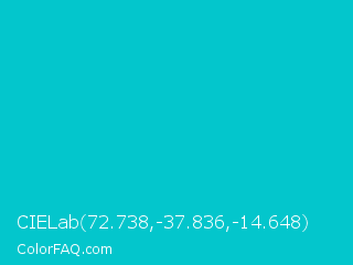 CIELab 72.738,-37.836,-14.648 Color is a normal cyan color and the nearest color is Turquoise Surf #00c5cd. Hex code #03c6cc and RGB value is rgb(3,198,204). In RGB color space, this color is composed of 1% red, 78% green, 80% blue, In CMYK color space, this color is composed of 99% cyan, 3% magenta, 0% yellow , 20% black , In HSL color space, this color has a hue angle of 182° , 97% saturation and 41% lightness.