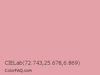 CIELab 72.743,25.678,6.869 Color is a light red color and the nearest color is Pastel Pink #dea5a4. Hex code #e4a1a7 and RGB value is rgb(228,161,167). In RGB color space, this color is composed of 89% red, 63% green, 65% blue, In CMYK color space, this color is composed of 0% cyan, 29% magenta, 27% yellow , 11% black , In HSL color space, this color has a hue angle of 355° , 55% saturation and 76% lightness.