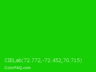 CIELab 72.772,-72.452,70.715 Color is a normal green color and the nearest color is Harlequin Green #46cb18. Hex code #17cf05 and RGB value is rgb(23,207,5). In RGB color space, this color is composed of 9% red, 81% green, 2% blue, In CMYK color space, this color is composed of 89% cyan, 0% magenta, 98% yellow , 19% black , In HSL color space, this color has a hue angle of 115° , 95% saturation and 42% lightness.