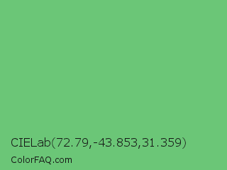 CIELab 72.79,-43.853,31.359 Color is a normal green color and the nearest color is Iguana Green #71bc78. Hex code #6bc677 and RGB value is rgb(107,198,119). In RGB color space, this color is composed of 42% red, 78% green, 47% blue, In CMYK color space, this color is composed of 46% cyan, 0% magenta, 40% yellow , 22% black , In HSL color space, this color has a hue angle of 128° , 44% saturation and 60% lightness.