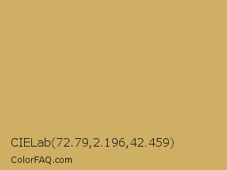 CIELab 72.79,2.196,42.459 Color is a normal orange color and the nearest color is Laser #c8b568. Hex code #cfaf64 and RGB value is rgb(207,175,100). In RGB color space, this color is composed of 81% red, 69% green, 39% blue, In CMYK color space, this color is composed of 0% cyan, 15% magenta, 52% yellow , 19% black , In HSL color space, this color has a hue angle of 42° , 53% saturation and 60% lightness.