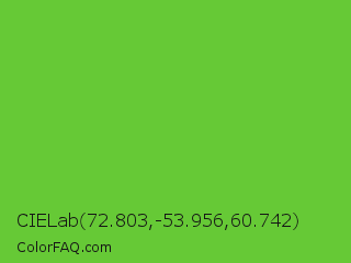 CIELab 72.803,-53.956,60.742 Color is a normal green color and the nearest color is Green RYB #66b032. Hex code #66c936 and RGB value is rgb(102,201,54). In RGB color space, this color is composed of 40% red, 79% green, 21% blue, In CMYK color space, this color is composed of 49% cyan, 0% magenta, 73% yellow , 21% black , In HSL color space, this color has a hue angle of 100° , 58% saturation and 50% lightness.