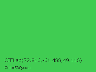 CIELab 72.816,-61.488,49.116 Color is a normal green color and the nearest color is UFO Green #3cd070. Hex code #40cc52 and RGB value is rgb(64,204,82). In RGB color space, this color is composed of 25% red, 80% green, 32% blue, In CMYK color space, this color is composed of 69% cyan, 0% magenta, 60% yellow , 20% black , In HSL color space, this color has a hue angle of 128° , 58% saturation and 53% lightness.