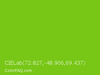 CIELab 72.827,-48.906,69.437 Color is a normal green color and the nearest color is Lima #76bd17. Hex code #78c717 and RGB value is rgb(120,199,23). In RGB color space, this color is composed of 47% red, 78% green, 9% blue, In CMYK color space, this color is composed of 40% cyan, 0% magenta, 88% yellow , 22% black , In HSL color space, this color has a hue angle of 87° , 79% saturation and 44% lightness.